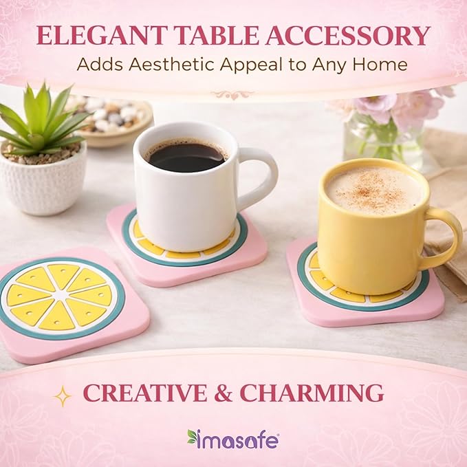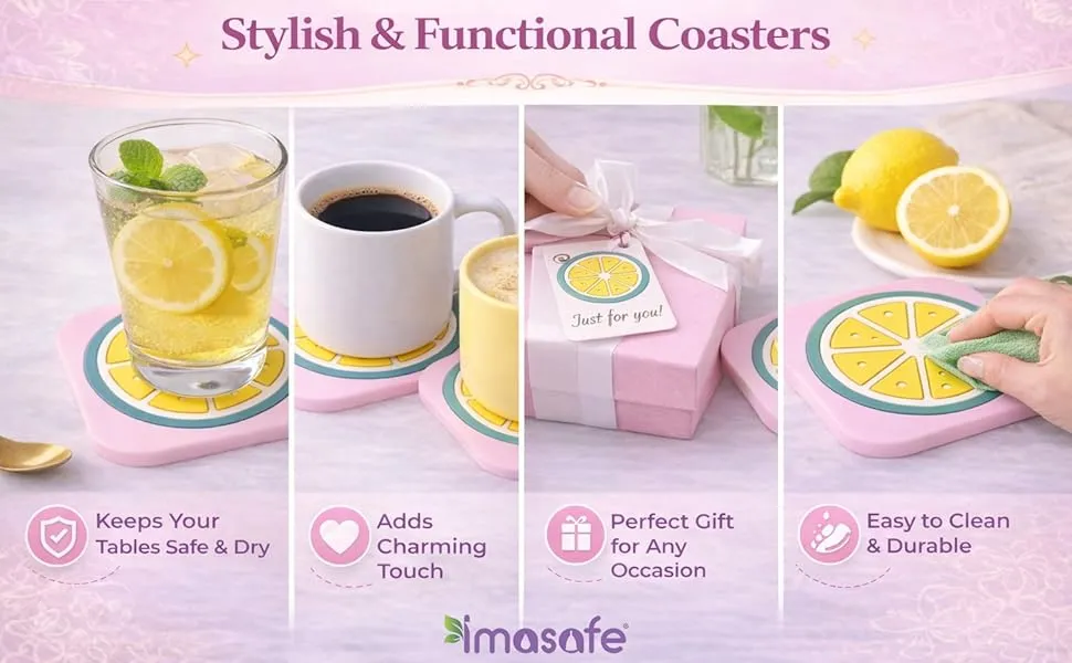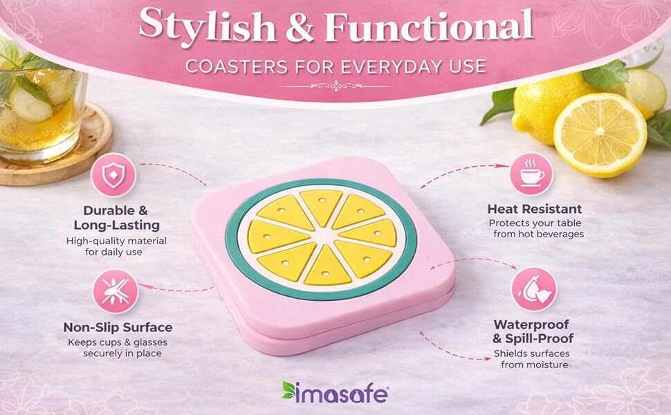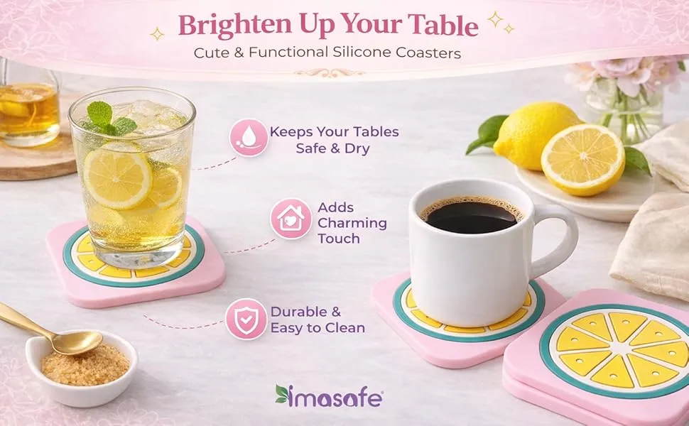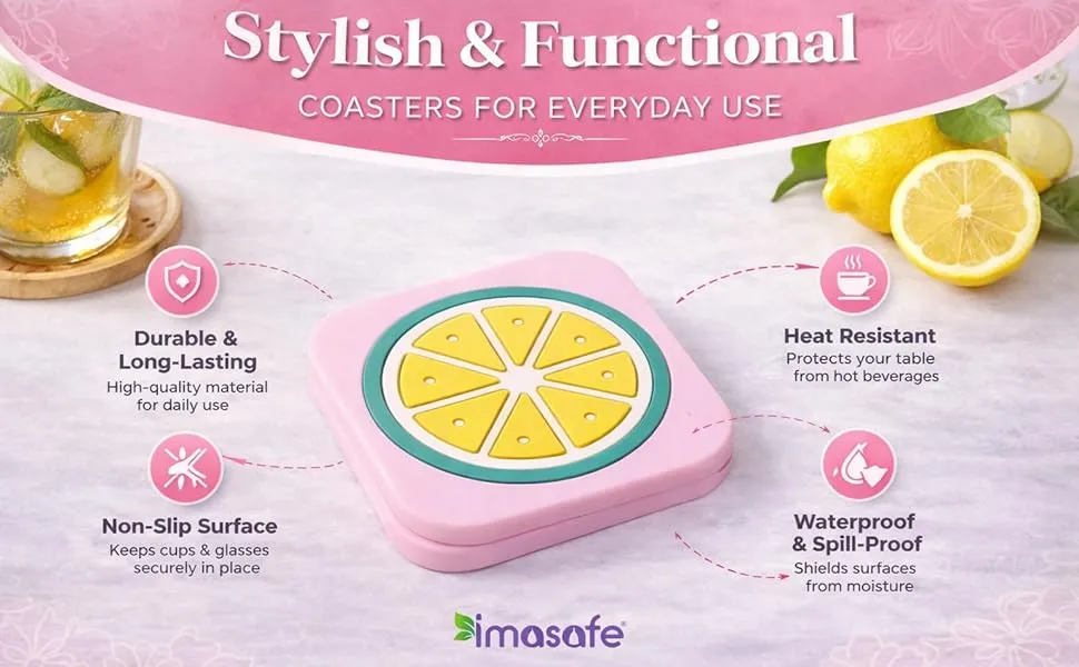 Protect your surfaces with Imasafe Silicone Coasters, designed for both hot and cold drinks. Made from durable, high-quality silicone, these coasters are heat resistant, waterproof, and feature a non-slip surface to keep your cups and glasses stable. Perfect for everyday use on dining tables, coffee tables, kitchen counters, or office desks, they are easy to clean, reusable, and built for long-lasting performance.